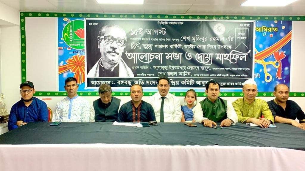 ১৫ আগস্ট জাতিরপিতা বঙ্গবন্ধু শেখ মুজিবুর রহমানের ৪৭তম শাহাদাৎ বার্ষিকী ও জাতীয় শোক দিবস উপলক্ষে বাংলাদেশ সমিতির অডিটোরিয়ামে বঙ্গবন্ধু স্মৃতি সংসদ আবুধাবি কেন্দ্রীয় কমিটির উদ্যোগে জাতীয় শোক দিবস পালন করা হয়েছে।