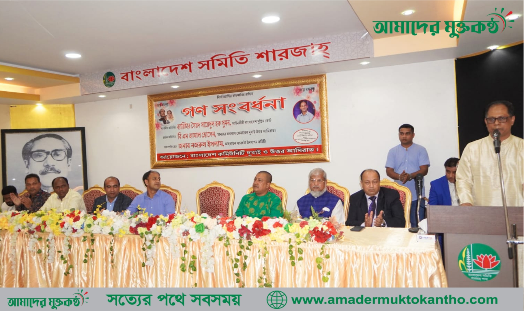 মানবতার ফেরিওয়ালা,সুপ্রিম কোর্টের আইনজীবী ব্যারিষ্টার সৈয়দ সায়েদুল হক সুমন সংযুক্ত আরব আমিরাত আগমন উপলক্ষে বাংলাদেশ কমিউনিটি দুবাই ও উত্তর আমিরাতের পক্ষ থেকে গতকাল ০৮/১০/২০২২ইং রোজ শনিবার সন্ধ্যা বাংলাদেশ সমিতি শারজাহ বঙ্গবন্ধু হলে এক গণ সংবর্ধনা’র আয়োজন করা হয়েছে। উক্ত অনুষ্ঠানে তিনি বলেন ১৮ বছর ধরে আমি এলাকার উন্নয়নে সক্রিয়ভাবে কাজ করে যাচ্ছি। মানুষের কল্যাণে কাজ করাকে আমি ইবাদত মনে করি। নিজের পেশা থেকে অর্জিত অর্থের সিংহভাগই আমি ব্যয় করি সাধারণ মানুষের কল্যাণে। আমার গন্তব্য নিজের সফলতা দিয়ে মৃত্যুর আগ পর্যন্ত জন্মভূমি ও এর বাইরের অবস্থানরত রেমিটেন্স যোদ্ধাদের জীবনমান উন্নয়নে সর্বসাধ্য দিয়ে চেষ্টা করা।