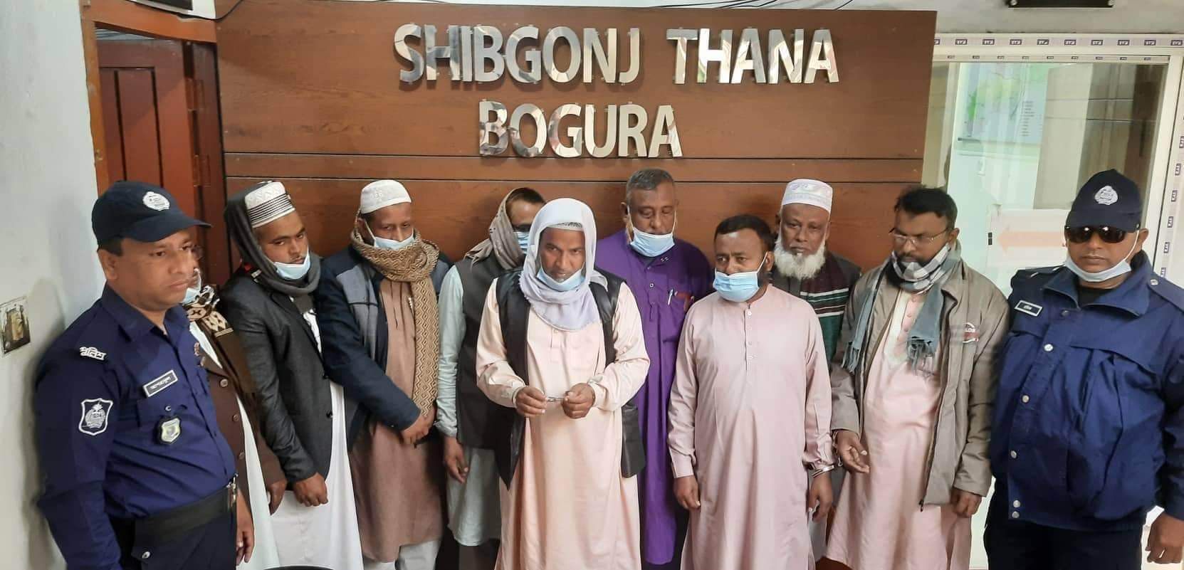 শনিবার বেলা ১১টার দিকে শিবগঞ্জ থানার অফিসার ইনচার্জ(ওসি) মনজুরুল আলম সংবাদ সম্মেলন করে বিষয়টি সাংবাদিকদের জানান। এর আগে শুক্রবার বিকেলে উপজেলার রায়নগর ইউনিয়নের করতকোলা গ্রামের জামায়েত নেতা ও সাবেক চেয়ারম্যান মৃত আব্দুল খালেকের বাড়ি থেকে ওই নয়জনকে আটক করা হয়। পরে দিবাগত রাতে তাদের বিরুদ্ধে বিশেষ ক্ষমতা আইনে মামলা দেয় পুলিশ।
